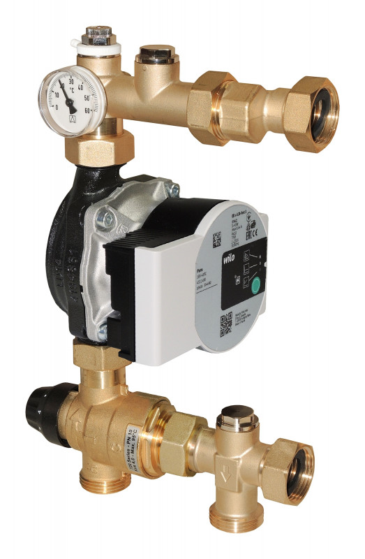 Il gruppo di regolazione Art. 687 FIX, grazie alle sue dimensioni estremamente contenute, viene installato direttamente nella cassetta di distribuzione di impianti a pannelli radianti. La costruzione consente il montaggio a sinistra o a destra del collettore.