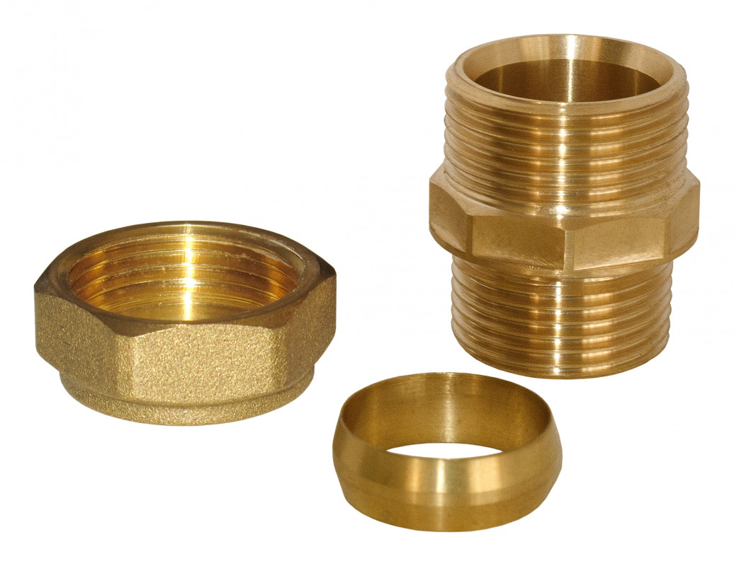 Set composto da raccordo a compressione 3/4” Maschio, calotta ed ogiva. Consente la connessione dei gruppi idraulici 3/4” Femmina a tubazioni in rame di diametro 15, 18 e 22 mm. Finitura gialla.