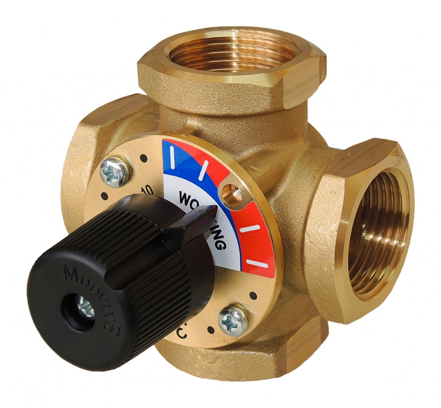 Valvola miscelatrice rotativa in ottone stampato per impianti di riscaldamento e raffreddamento. Finitura gialla. La valvola può essere automatizzata abbinando un servomotore della gamma ModvlvS o commerciale.