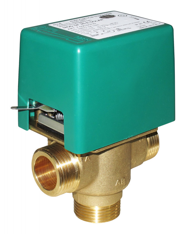 Valvola di zona a tre vie motorizzata con ritorno a molla per circuiti idraulici chiusi. Applicazione: riscaldamento, condizionamento e solare termico (glicole max. 50%).
