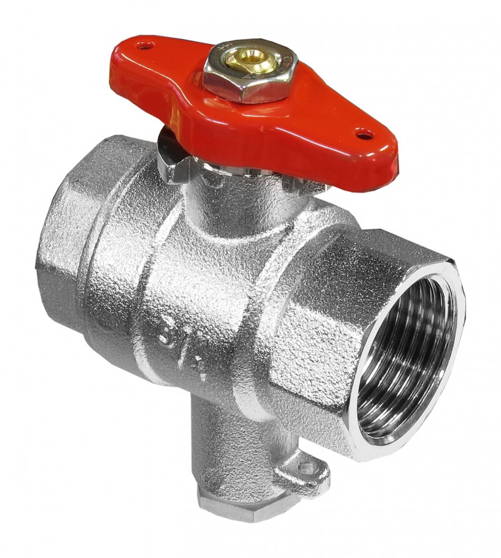 Valvola a sfera F/F in ottone stampato per contabilizzatori di energia, con attacco M10x1 per sonda di temperatura o5 mm. Piombabile.