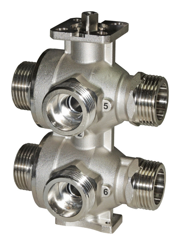 Valvola a sfera a 6 vie in ottone stampato, per la gestione della climatizzazione in impianti di riscaldamento e raffrescamento, in particolare per sistemi dotati di fan-coil. Consente la commutazione tra due distinte fonti di energia per la singola utenza o zona, cioè il passaggio da riscaldamento a raffrescamento e viceversa, evitando di mettere in comunicazione i due circuiti caldo e freddo, che lavorano a pressioni differenti.