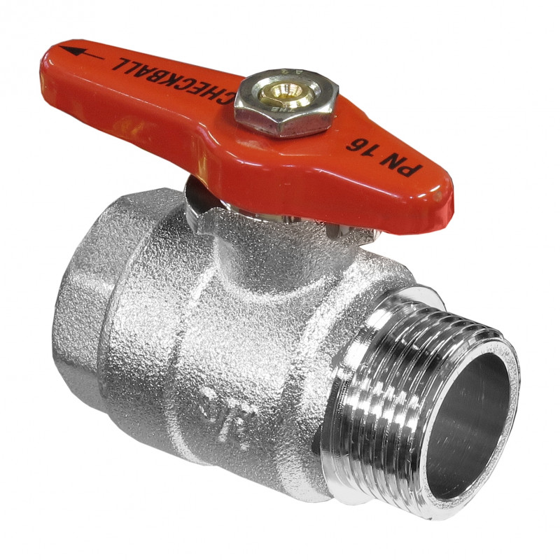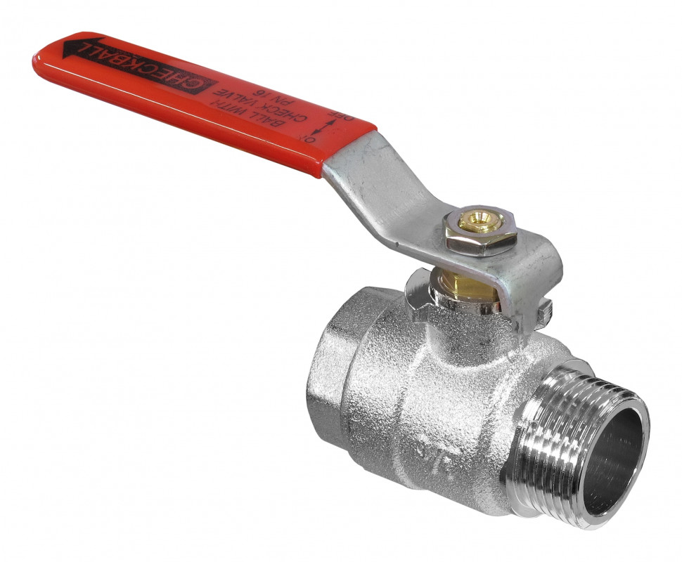 Valvola a sfera M/F in ottone stampato con valvola di non ritorno integrata nella sfera, escludibile ruotando la maniglia di 45°.