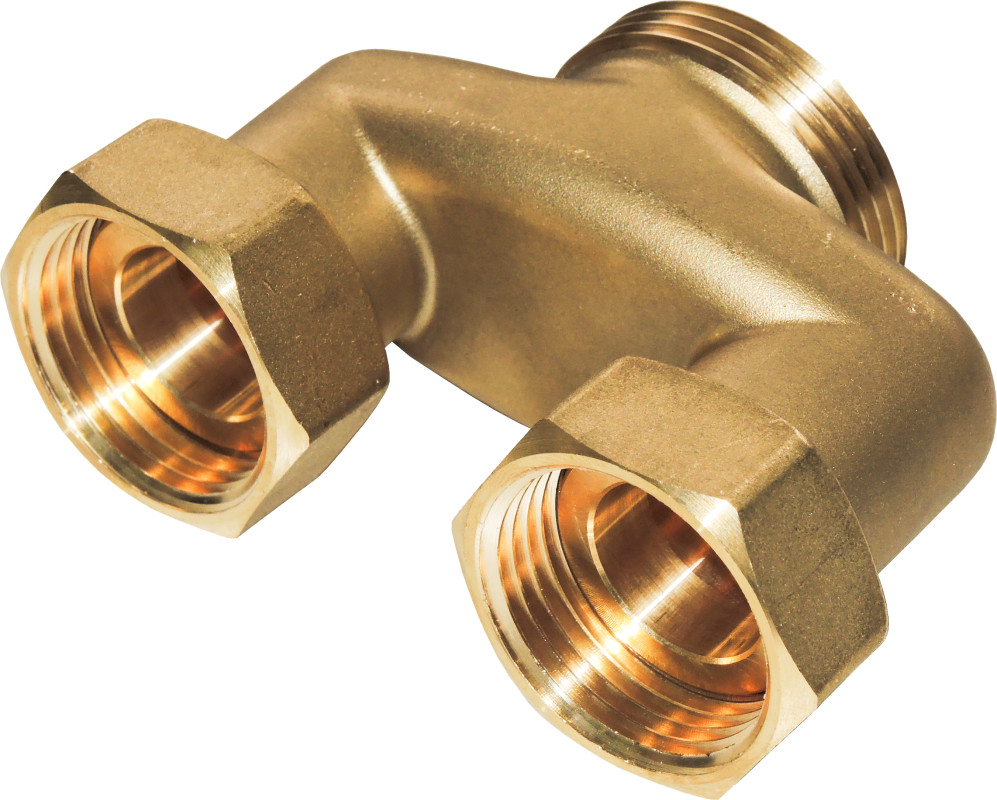 Raccordo in ottone con doppia connessione a “Y” con calotta girevole. Finitura gialla.