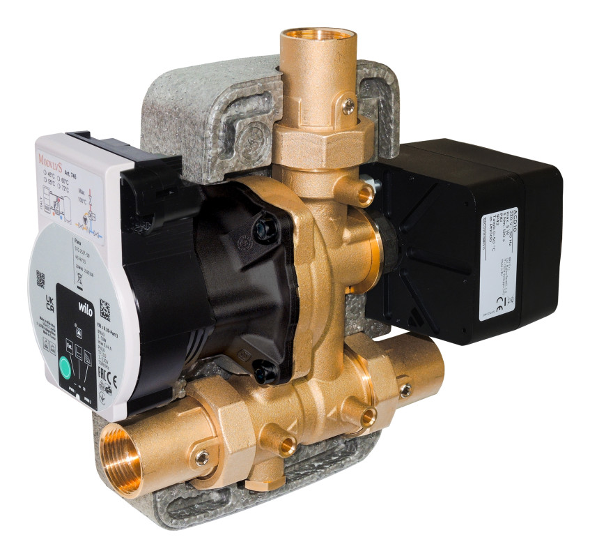 Il gruppo di circolazione anticondensa consente di collegare direttamente il generatore a combustibile solido al sistema di riscaldamento o all’accumulatore inerziale senza l’ausilio di altri dispositivi. Il gruppo infatti racchiude in un compatto ed elegante isolamento la pompa di circolazione, la valvola miscelatrice a controllo elettronico, il clapet di circolazione naturale escludibile, valvole di isolamento e termometri. Esso regola automaticamente, al valore impostato sul servomotore, la temperatura dell’acqua di ritorno al generatore.