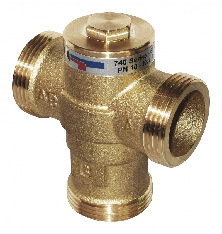 Valvola termica anticondensa con controllo termostatico della temperatura di ritorno verso generatori di calore a combustibile solido.