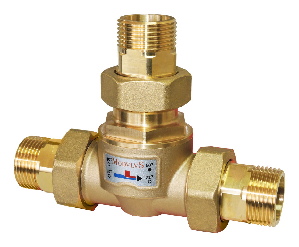 Valvola termica anticondensa con controllo termostatico della temperatura di ritorno verso generatori di calore a combustibile solido. Corpo in ottone stampato con attacchi a bocchettone. Finitura in ottone giallo.