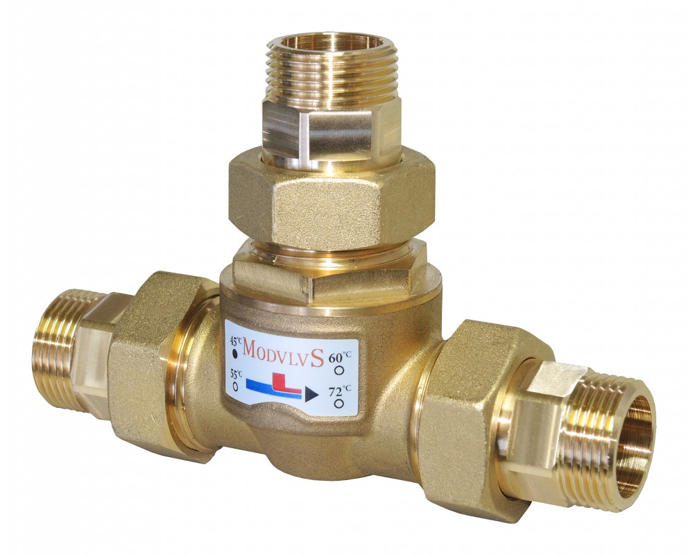 Valvola termica anticondensa con controllo termostatico della temperatura di ritorno verso generatori di calore a combustibile solido. Corpo in ottone stampato con attacchi a bocchettone. Finitura in ottone giallo.