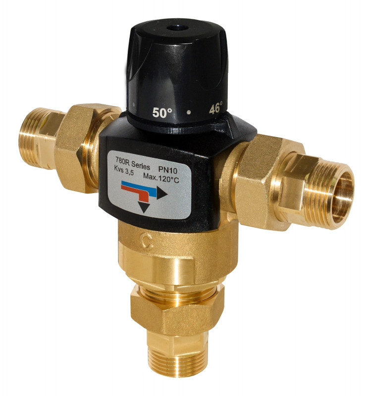Valvola deviatrice termostatica con temperatura di deviazione regolabile da 38°C a 54°C attraverso manopola graduata. Possibilità di bloccare la rotazione della manopola. Valvola di non ritorno per alta temperatura e filtro, inseriti nel raccordo d’ingresso. Corpo in ottone stampato. Finitura in ottone giallo.