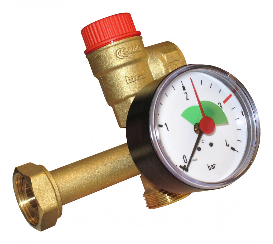 Gruppo di sicurezza con valvola di sicurezza 3 bar certificata CE secondo la Direttiva 97/23/CE e TÜV. Manometro ø63 mm 0-4 bar. Connessione 3/4” maschio per tubo flessibile o kit di scarico (103647P).