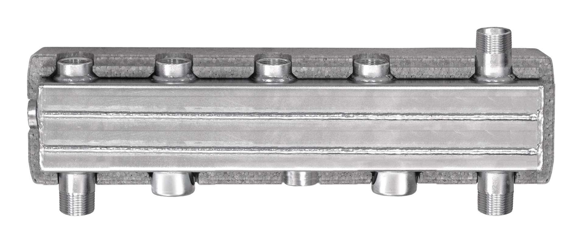 Collettore di distribuzione isolato con separatore idraulico integrato per potenze fino a 50 kW (con salto termico ∆T=20 K nel circuito primario). Camera di disaerazione con attacco 1” maschio tenuta piana per gruppo di sicurezza SG50-Mini/C.