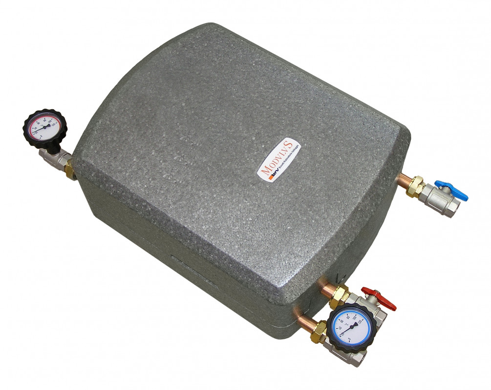 • Completamente isolato termicamente con guscio in PPE (398 x 500 x 207 mm). Una speciale piastra metallica posteriore fissa il gruppo all’isolamento e consente una facile installazione sia a parete che al puffer;