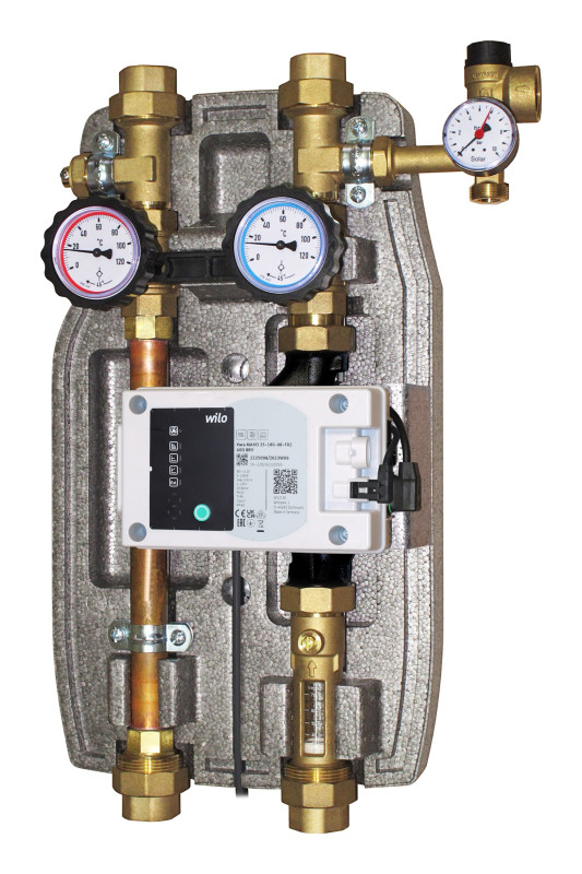 Il gruppo con circolatore solare da 1” (180 mm), completamente montato e collaudato, consiste di: