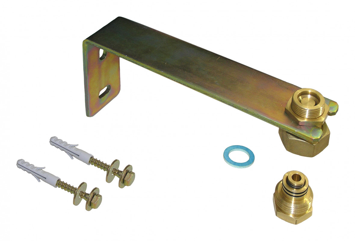 Staffa a “L” per il fissaggio a muro del vaso di espansione. Il raccordo da 3/4” maschio x 3/4” femmina è provvisto di una doppia valvola di non ritorno completamente in ottone per poter sostituire il vaso di espansione senza scaricare l’impianto. Inclusi tasselli a muro e guarnizione in fibra.
