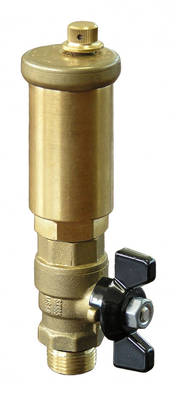 Valvola automatica di sfiato aria con rubinetto di intercettazione per impianti solari termici a circolazione forzata. Corpo in ottone e componenti plastici resistenti alle alte temperature (PPSU).